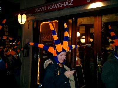 New Year’s Eve in Budapest is akin to a Mardi Gras celebration. Costumed people, live music, fireworks, drinking on the street, long cardboard horns that people use to make noise, but more likely to hit other revelers on the head with.