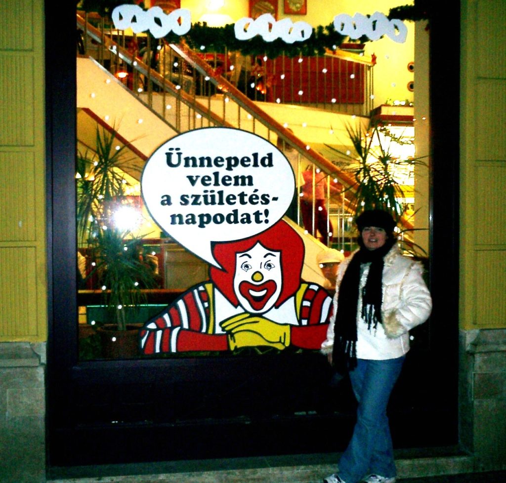 That first day I was groggy while Cookie and Janos toured me around Budapest. From Hero’s Square and the City Park (Varosliget)where we saw the ice skating rink by Vajdahunyad Castle , we headed down to Vorosmarty Ter, a walking area of shops and restaurants. They were happy to show me the “MACK-dunnald”(heavy emphasis on MACK to make the name unrecognizable) and the image of Ronald McDonald saying, “Celebrate your birthday with me,” in Hungarian. We had dinner a bit further down the road at the Szaz Eves Etterem –the 100 Year Restaurant. My luck, the “100 year” part of the name turned out to describe the length of time one will wait for the food to be served, or at least it seemed that way to my jet-lagged brain.