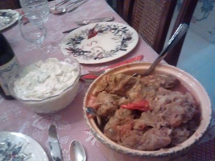 Lay each cabbage leaf on a clean, flat work surface. Place approximately ¼ cup of meat filling into center of the leaf. Fold the outside edges in and roll the leaf around the stuffing. Place seam side down in a large Dutch oven or crock pot with the sauce in the bottom. Pour drained sauerkraut over the rolls and add the whole pepper to the pot, and cover.
